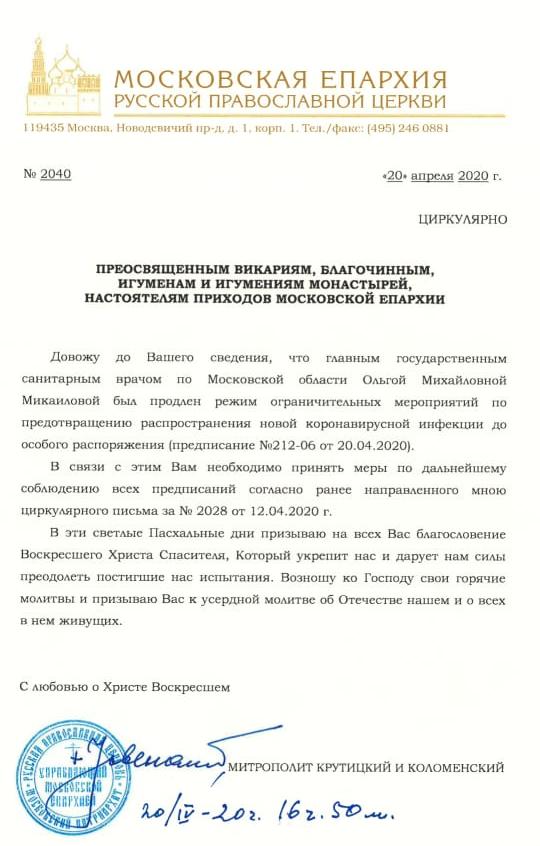 ЦИРКУЛЯР Московской епархии от 29.04.2020 N 2051
